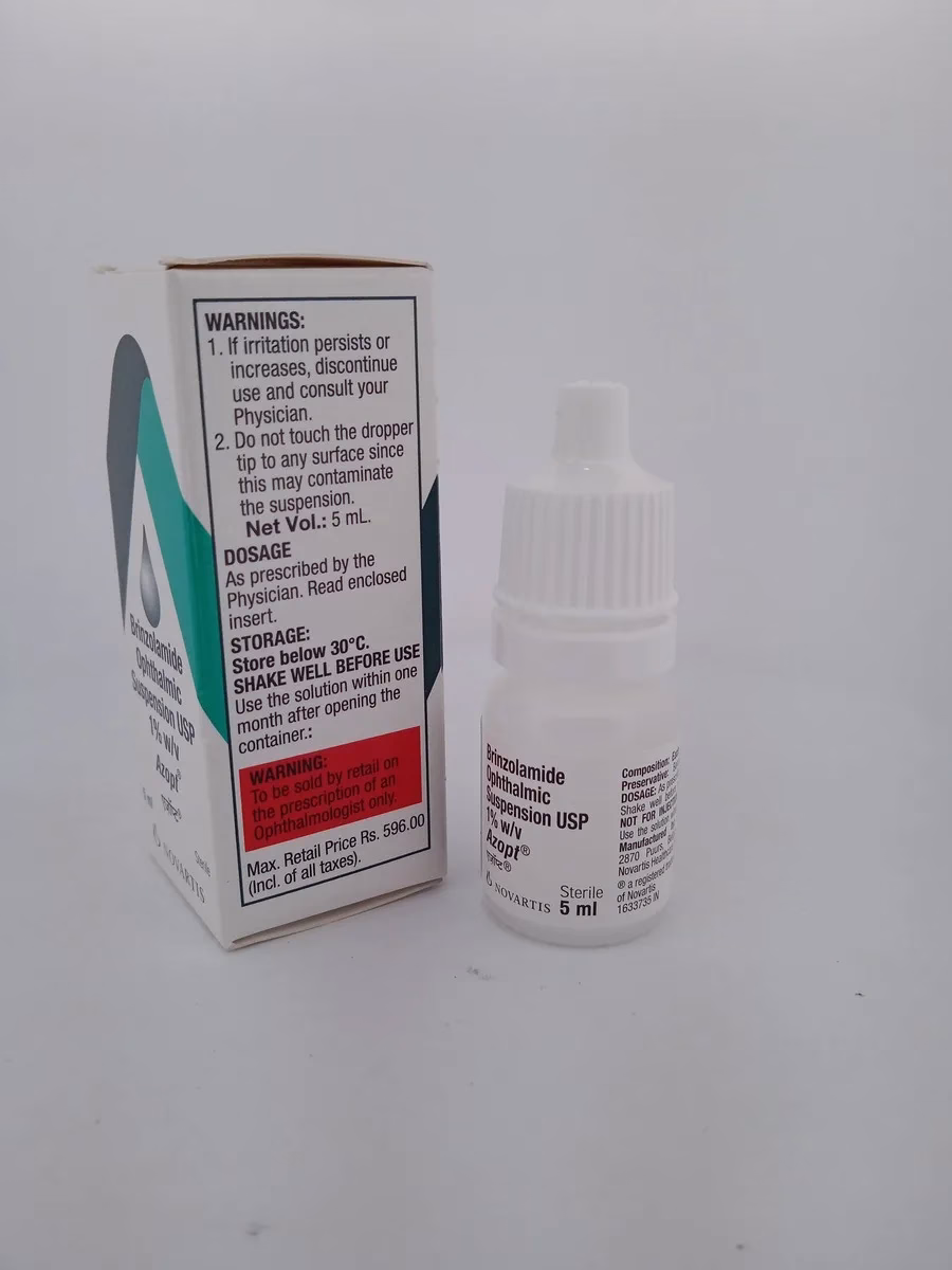 AZOPT 10 MG EYE DROPS contain 10 mg/ml of brinzolamide, a carbonic anhydrase inhibitor used to treat elevated intraocular pressure associated with glaucoma and ocular hypertension. Brinzolamide works by reducing the production of aqueous humor in the eye, thereby lowering intraocular pressure. This helps prevent damage to the optic nerve and supports long-term eye health. AZOPT 10 MG EYE DROPS offer a non-steroidal approach to managing intraocular pressure, providing an effective alternative for those who need to control their eye pressure.