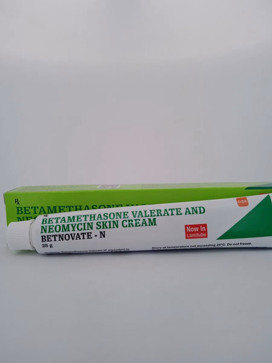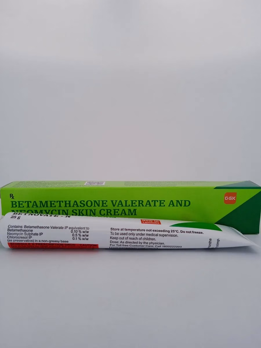 BETNOVATE-N Cream is a potent topical treatment that combines Betamethasone, a corticosteroid, with Neomycin, an antibiotic. This dual-action formulation is designed to alleviate inflammation, itching, and redness while also addressing bacterial infections. It is effective for treating conditions like eczema, dermatitis, and bacterial skin infections.