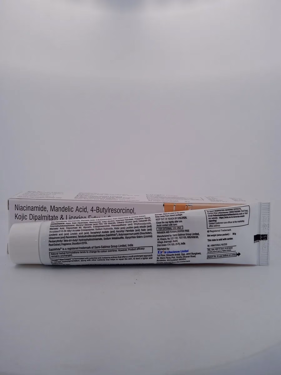 COSGLO NEW CREAM is formulated to aid in wound healing and skin restoration. It works by enhancing the deposition of hydrophilic agents that lighten the skin and combat melasma. This cream not only improves skin brightness but also supports the re-establishment of normal skin texture, offering a clearer, more radiant complexion.