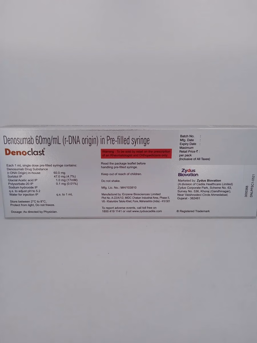 DENOCLAST 60 MG contains Denosumab, a potent monoclonal antibody that reduces bone resorption by inhibiting osteoclasts, the cells that break down bone. By slowing down the loss of bone density and improving bone strength, DENOCLAST helps lower the risk of fractures, especially in the spine and hips. It is suitable for long-term osteoporosis management and is administered as an injection every six months.