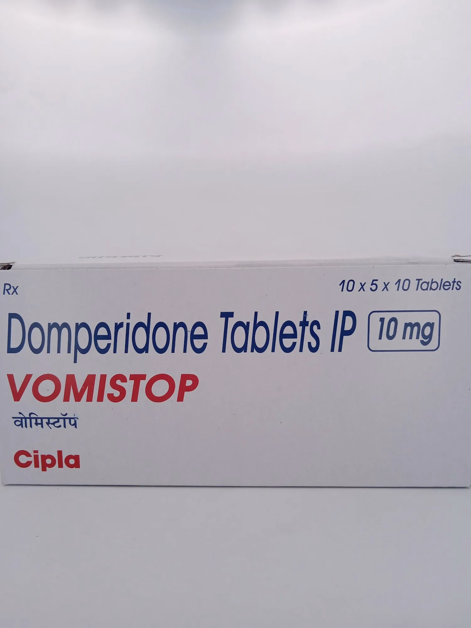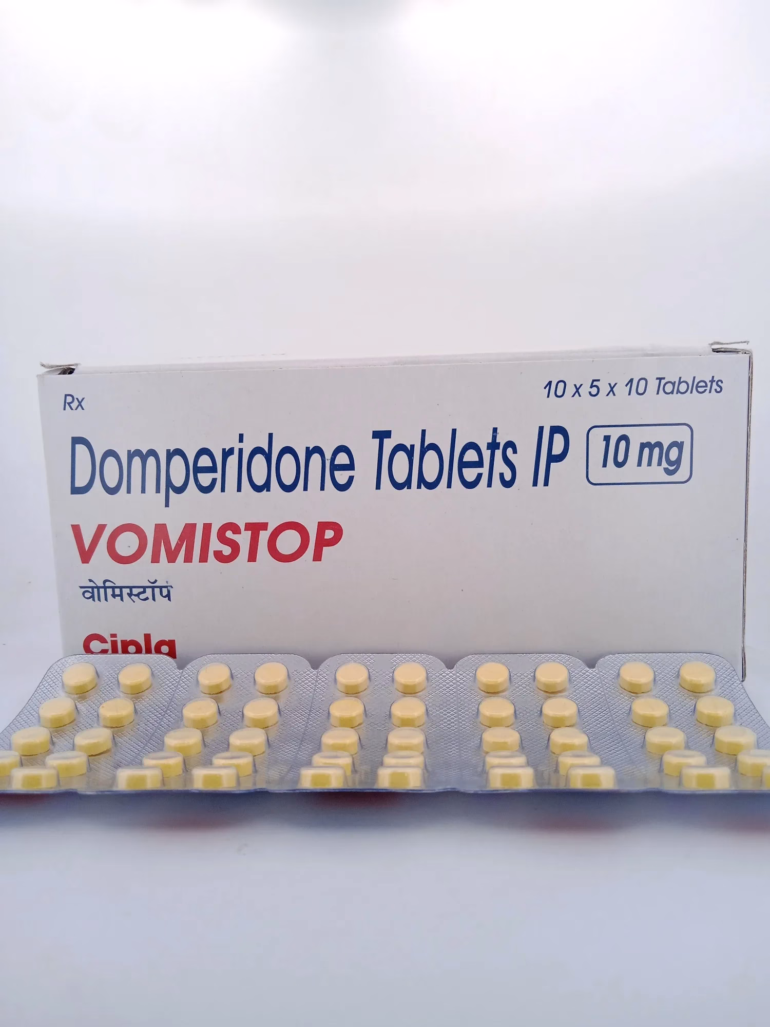 VOMISTOP 10mg Tablets contain Domperidone, a proven antiemetic and prokinetic agent. Domperidone works by blocking dopamine receptors in the brain and upper digestive tract, enhancing gastric motility and preventing reflux. This mechanism alleviates symptoms such as nausea, vomiting, bloating, and indigestion, restoring digestive comfort and function.  500 pill pack