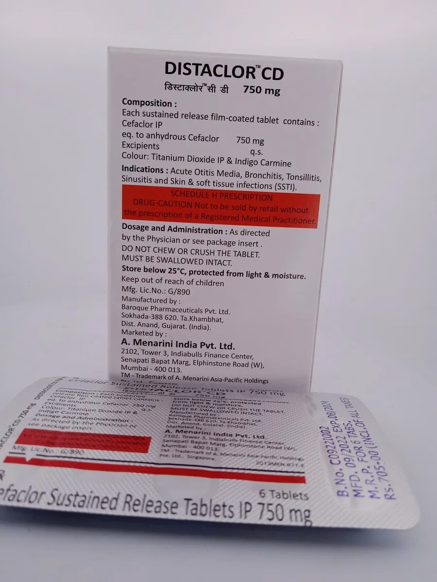 DISTACLOR CD 750 MG, containing Cefaclor, is an antibiotic tablet designed to treat a wide range of bacterial infections. It provides consistent and effective relief by maintaining steady drug levels in the body, making it ideal for respiratory tract infections, skin infections, and urinary tract infections.