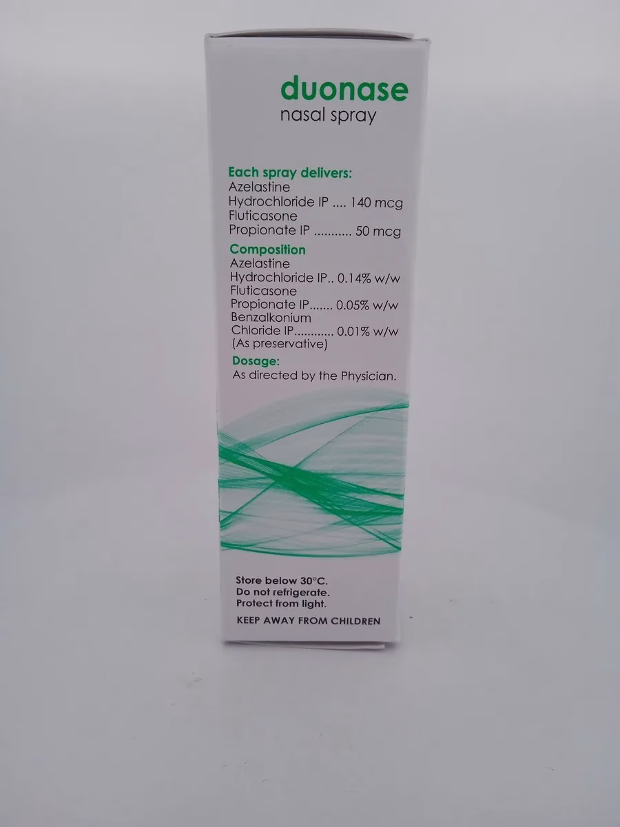 DUONASE Nasal Spray is a highly effective treatment for nasal allergies and sinus congestion. It combines the benefits of fluticasone propionate, a corticosteroid, and azelastine, an antihistamine, to provide comprehensive relief from allergy symptoms and improve nasal breathing.