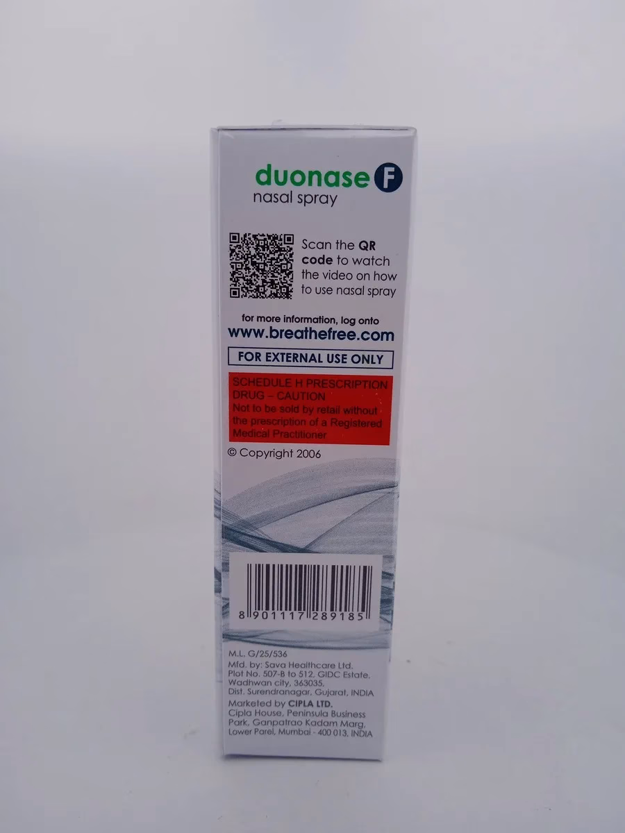 DUONASE F Nasal Spray works through a dual mechanism. Fluticasone propionate, a corticosteroid, reduces inflammation in the nasal mucosa, decreasing swelling and mucus production. Azelastine, an antihistamine, blocks histamine receptors in the nasal passages, reducing allergic reactions such as itching and sneezing. Together, these ingredients address multiple aspects of nasal allergy symptoms and congestion.