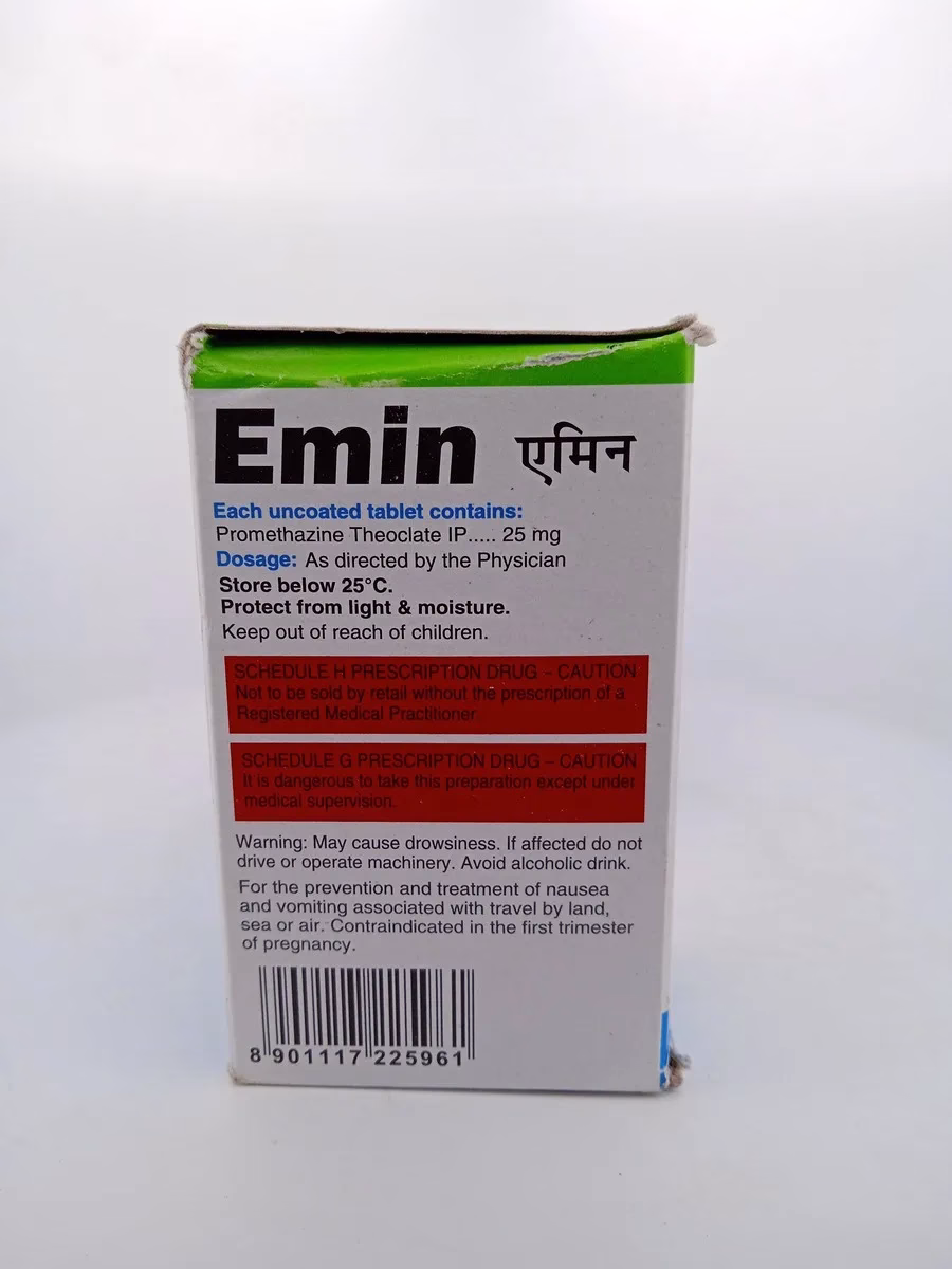 EMIN 25mg contains Promethazine TheoClate, a potent medication renowned for its efficacy in relieving allergies, nausea, and motion sickness. Its fast-acting formula ensures rapid relief, providing comfort and improving daily functioning.