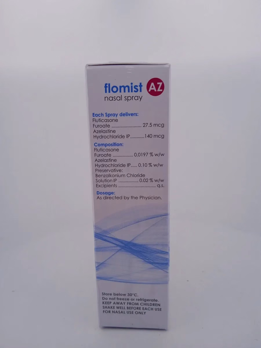 FLOMIST AZ Nasal Spray provides effective relief from nasal allergies and congestion with its dual-action formula of fluticasone propionate and azelastine. It reduces inflammation and blocks histamine to improve nasal breathing and alleviate symptoms.