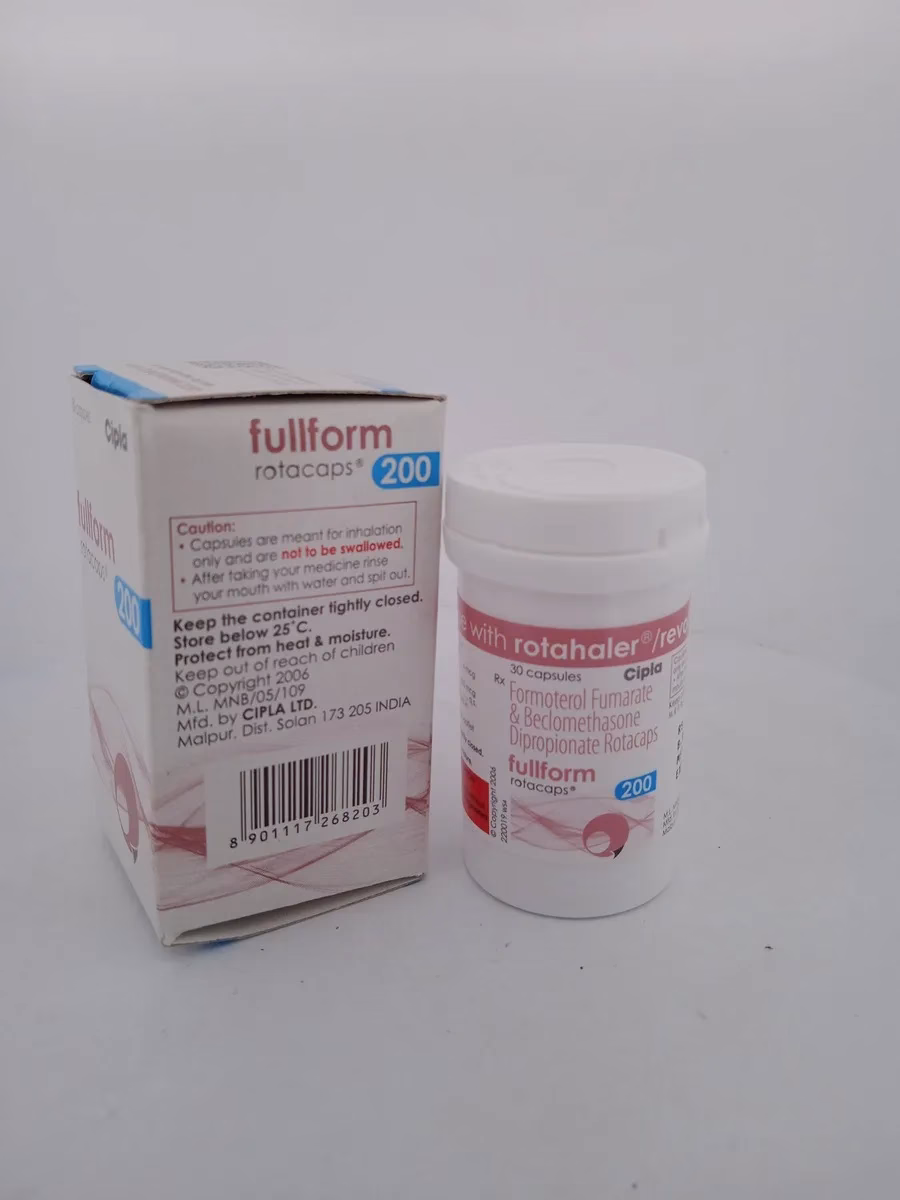 FULLFORM ROTACAPS 200 is a dual-action inhaler designed to manage asthma and chronic obstructive pulmonary disease (COPD). It contains Beclometasone 200mcg, a corticosteroid that reduces inflammation in the airways, and Formoterol 6mcg, a long-acting bronchodilator that helps in keeping the airways open. Together, they provide long-lasting relief from breathing difficulties, wheezing, and chest tightness.