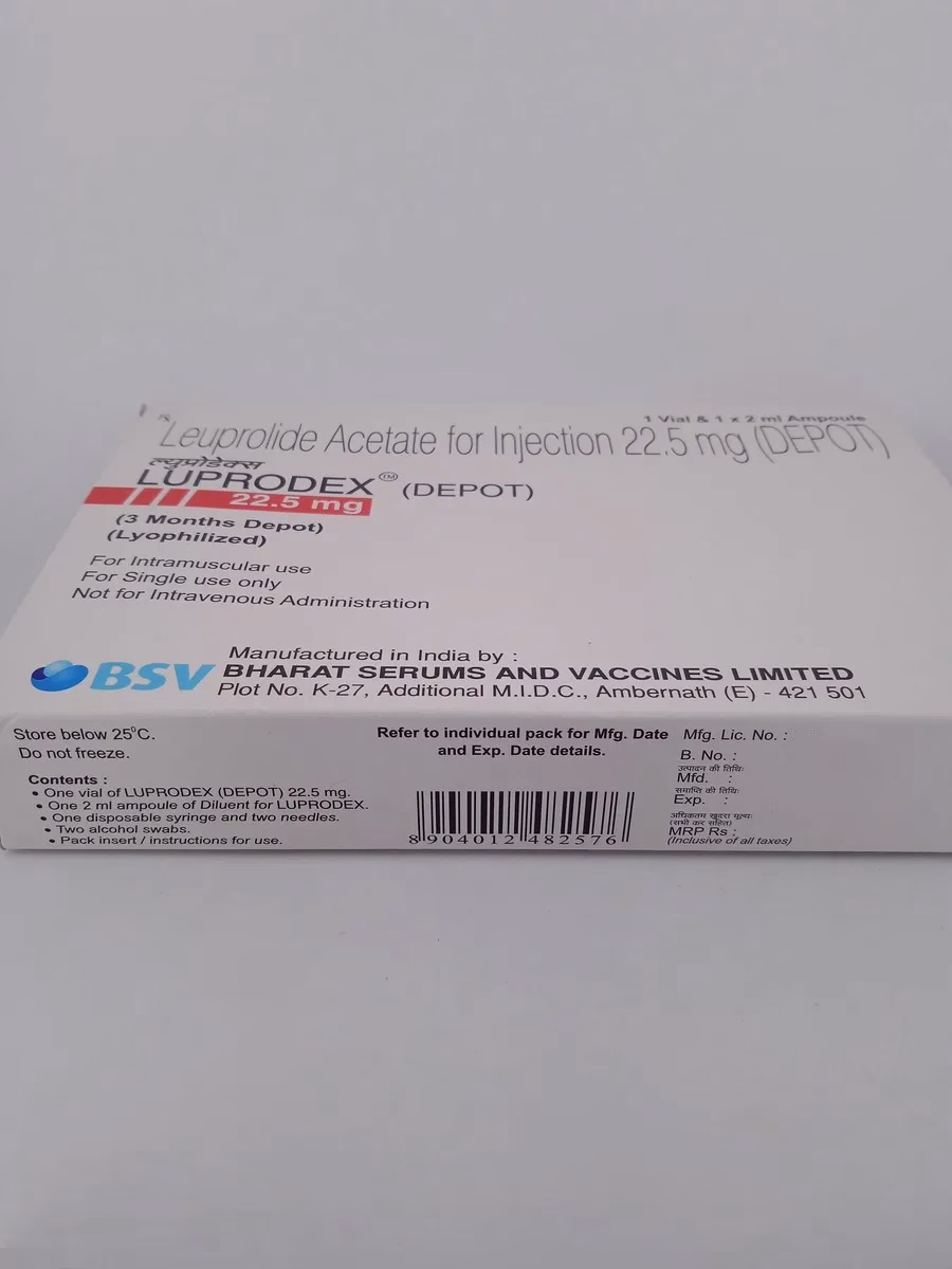 LUPRODEX DEPOT 22.5 MG is a hormonal therapy medication used to treat prostate cancer, endometriosis, uterine fibroids, and premature puberty. It works by reducing hormone levels that contribute to these conditions, helping alleviate symptoms and improve quality of life.