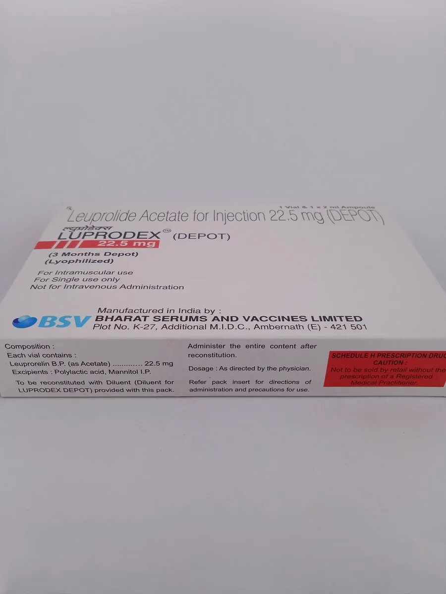 LUPRODEX DEPOT 22.5 MG contains Leuprorelin Acetate, a synthetic hormone analog used for treating several hormone-related conditions. It is commonly prescribed for managing prostate cancer by suppressing testosterone levels. In women, it treats endometriosis and uterine fibroids by reducing estrogen production. Additionally, it helps manage cases of premature puberty by delaying early sexual development. The long-acting formulation ensures continuous symptom relief over extended periods.