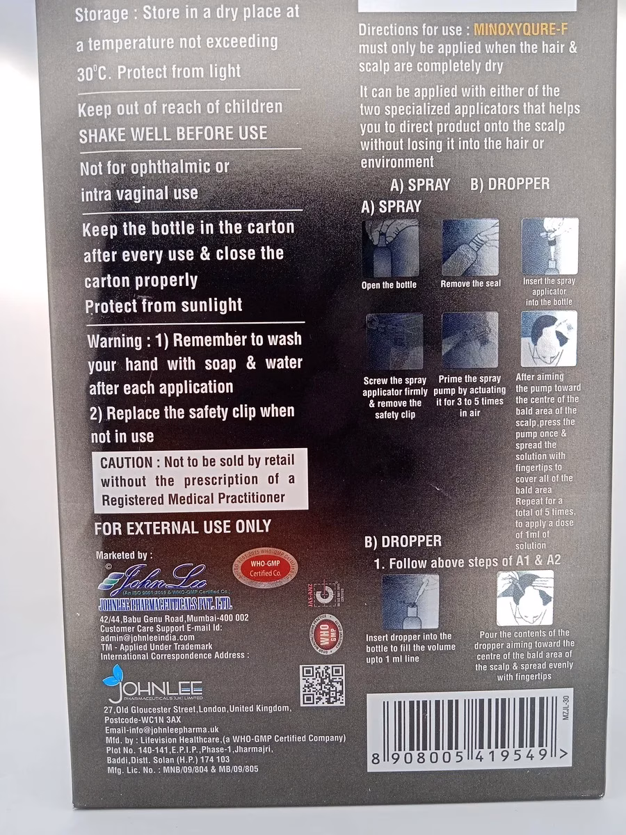 Usage Instructions: Apply MINOXYQURE-F topically to the scalp once daily, preferably in the evening. Part your hair and apply the solution directly to the affected areas, ensuring full coverage. Massage gently into the scalp and allow it to dry completely before styling your hair as usual. Consistent daily use is essential for optimal results.