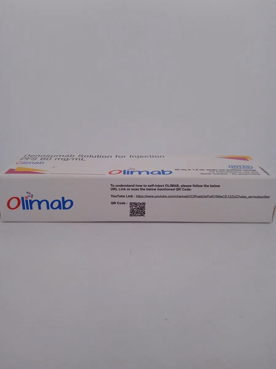 OLIMAB 60 MG contains Denosumab, a monoclonal antibody that works by inhibiting a protein involved in bone breakdown. It is used in treating osteoporosis in postmenopausal women and men who are at an increased risk of fractures. By reducing bone loss and increasing bone density, OLIMAB helps protect against debilitating fractures, especially in the hips and spine.