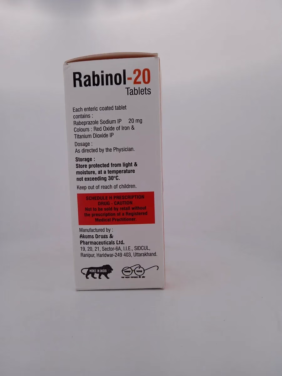 Storage Conditions: Store RABINOL 20MG Tablet at room temperature away from moisture and heat. Keep it out of reach of children and pets.