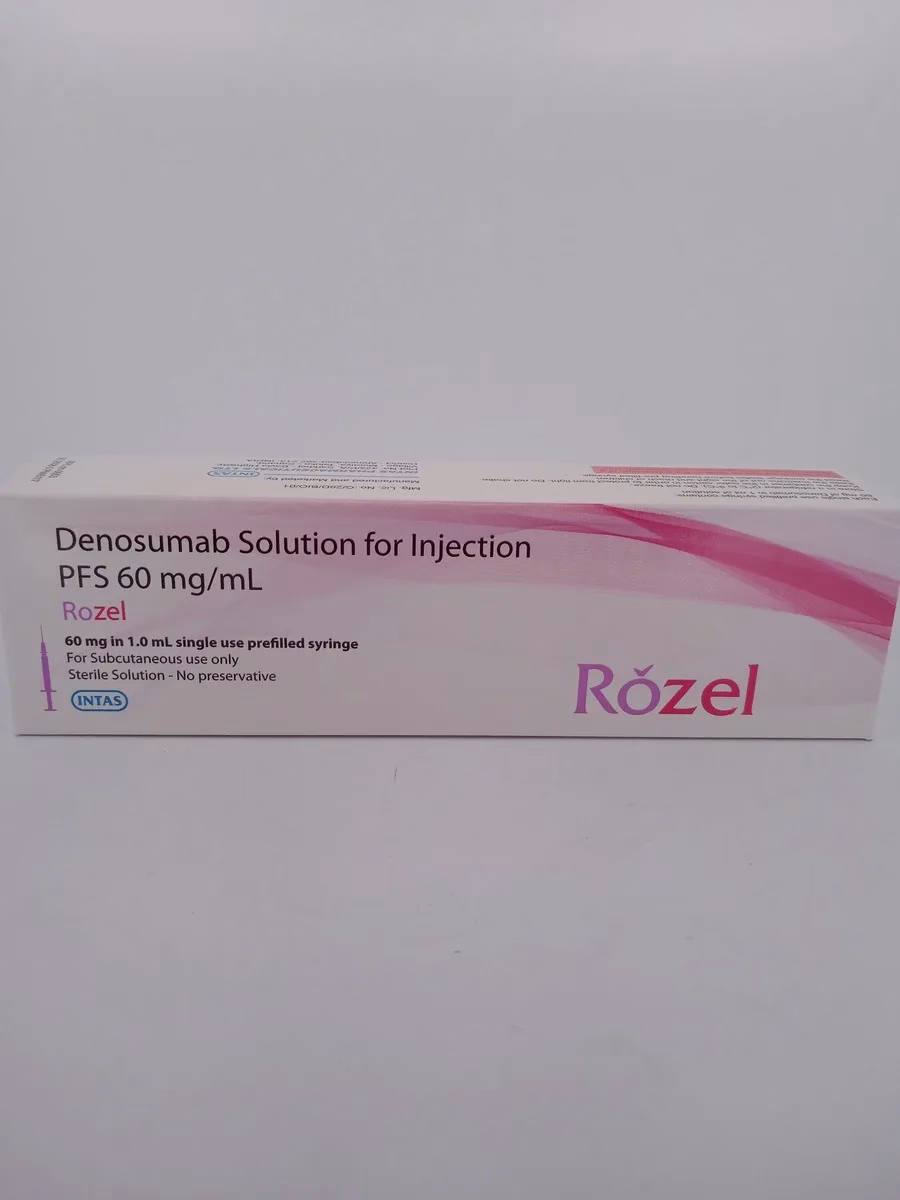 ROZEL 60 MG contains Denosumab, a monoclonal antibody that inhibits the activity of osteoclasts, which are cells responsible for bone resorption. By reducing bone breakdown and increasing bone density, ROZEL effectively lowers the risk of fractures, particularly in the spine and hips. It is a long-term treatment aimed at improving bone health in individuals with osteoporosis.
