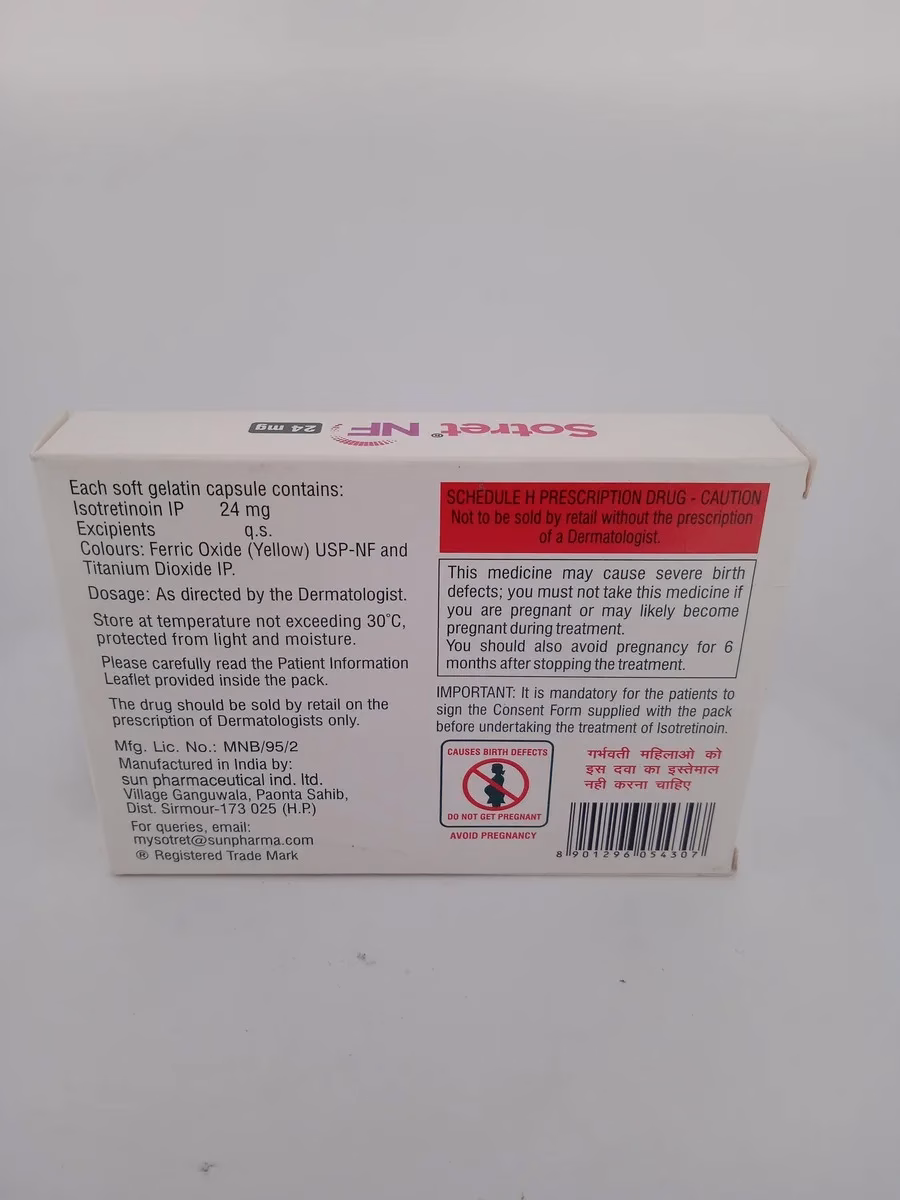 SOTRET NF 24 MG effectively treats severe acne and related skin disorders by targeting the underlying causes of skin inflammation and excess oil production. It helps to reduce acne lesions and improve skin appearance, making it a valuable option for those with persistent skin conditions.