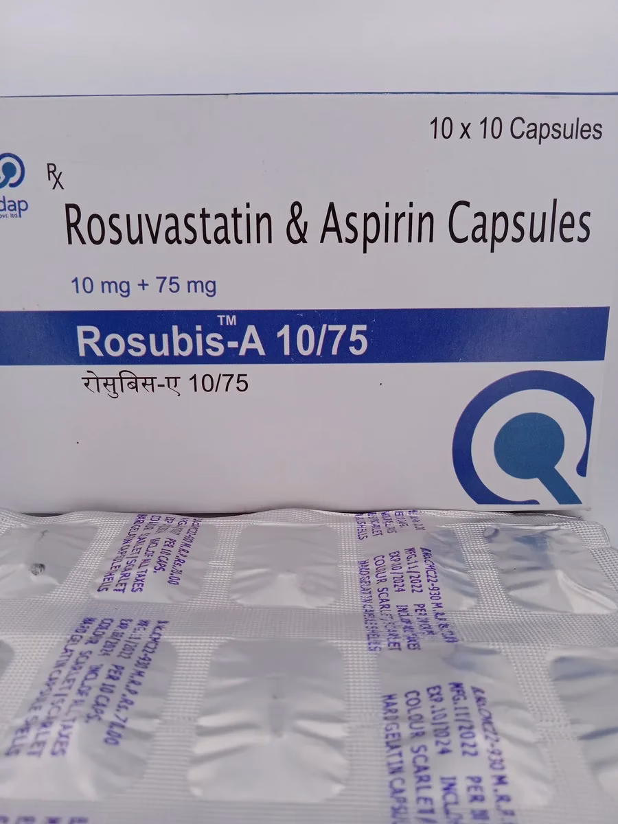 ROSUBIS A is a synergistic combination of Rosuvastatin (10 mg) and Aspirin (75 mg). Rosuvastatin helps lower LDL cholesterol and triglyceride levels, reducing the risk of heart disease. Aspirin, on the other hand, acts as an antiplatelet agent, preventing blood clots that can lead to heart attacks or strokes. Together, these ingredients provide a robust approach to managing cardiovascular health and preventing related complications.