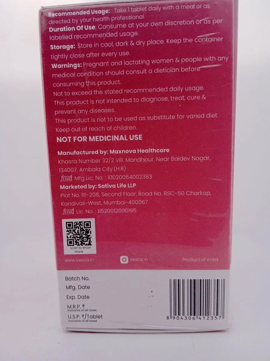 Usage Instructions: Take two VESCA MULTIVITAMIN for Women tablets daily with a meal or as directed by your healthcare professional. Ensure adequate hydration throughout the day for optimal absorption of nutrients.